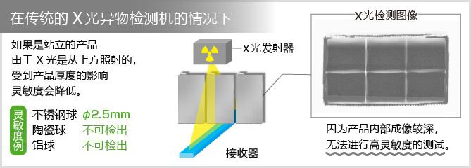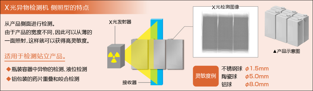 由于与检测机平行放置时盒子的厚度(深度)最小,因此建议使用X光异物检测机侧照型来获得高灵敏度。 决定引入它的原因是,在样品测试中确认了检测灵敏度。